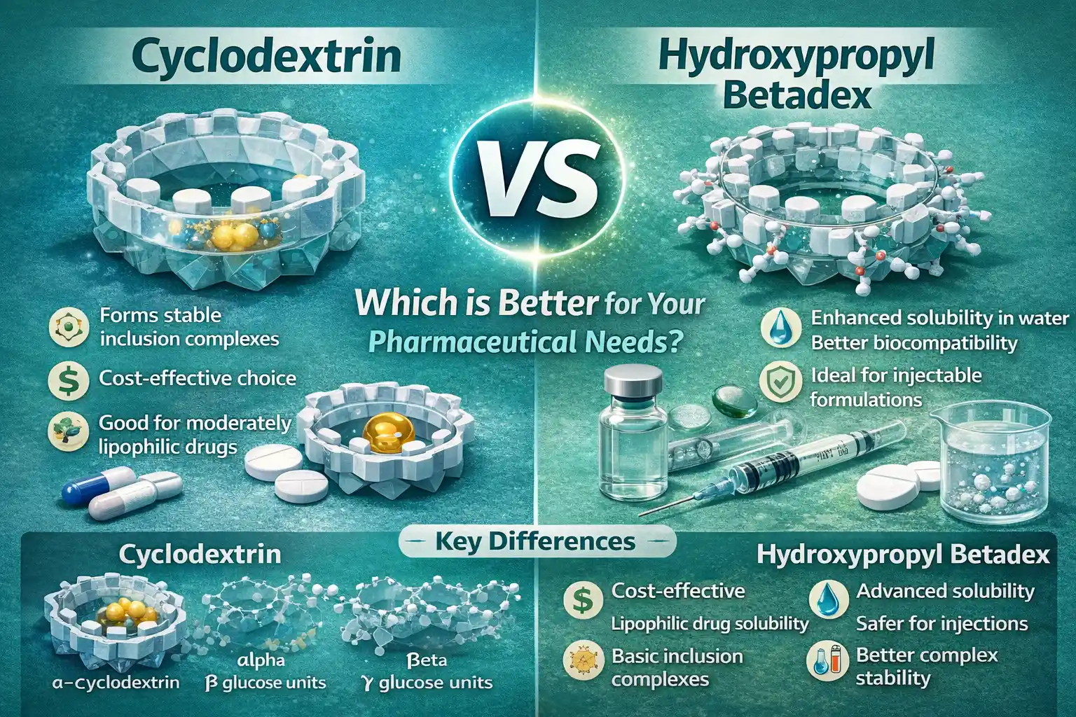 Когда дело доходит до фармацевтического применения, циклодекстрин игидроксипропил бетадексоба по-своему хороши для методов доставки лекарств. Стандартные циклодекстрины хорошо удерживают молекулы и являются экономически эффективными. С другой стороны, гидроксипропилбетадекс лучше растворяется в воде и более биосовместим. Выбор зависит от потребностей вашей рецептуры: гидроксипропилбетадекс обеспечивает улучшенную растворимость сложных молекул лекарств, а циклодекстрины превосходно образуют основные комплексы включения.