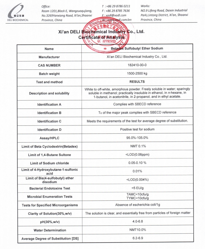 Этот инъекционный сульфобутиловый эфир бета-циклодекстрин натрия производится в соответствии с комплексной системой управления качеством. Ключевые показатели качества, включая идентификацию, анализ, среднюю степень замещения, остаточные примеси, уровни эндотоксинов и микробные пределы, строго контролируются.